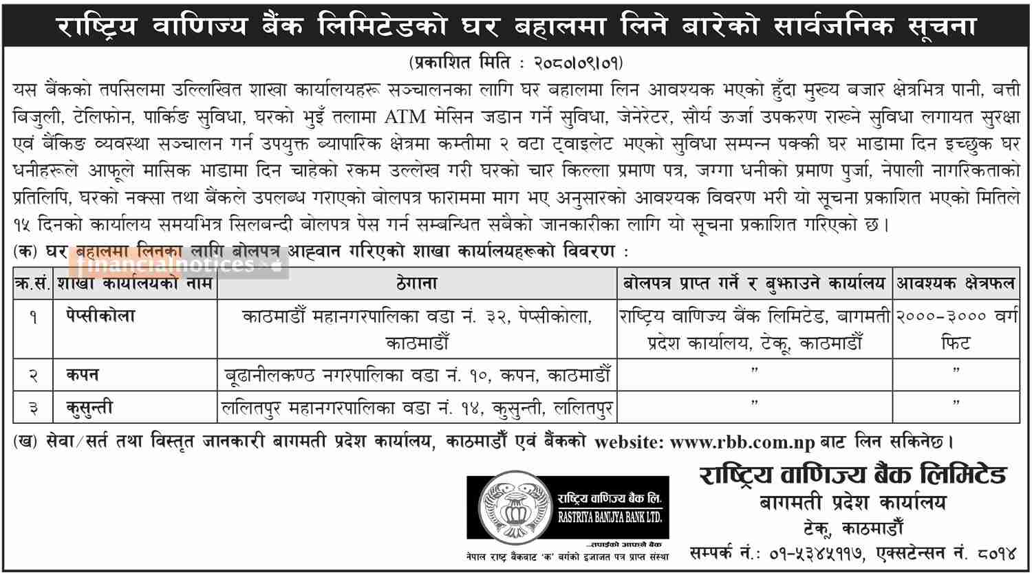 राष्ट्रिय वाणिज्य बैंकलाई कार्यालय भवनको आवश्यकता सम्बन्धी सूचना