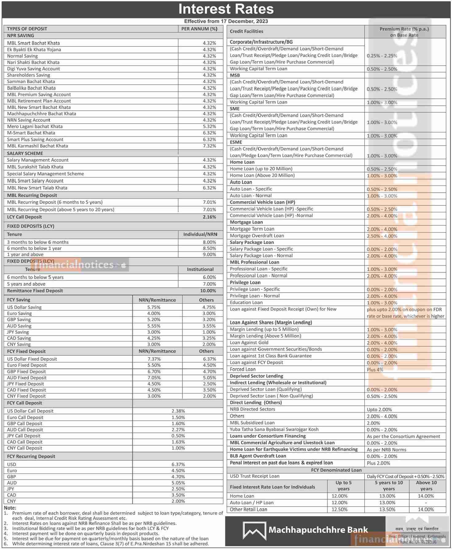 माछापुच्छ्रे बैंकको पौष १ गतेदेखि लागु हुने नयाँ ब्याजदर तालिका सार्वजनिक - Interest Rates