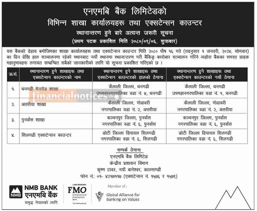 विभिन्न शाखा कार्यालयहरु तथा एक्सटेन्सन काउण्टर स्थानान्तरण सम्बन्धी सूचना