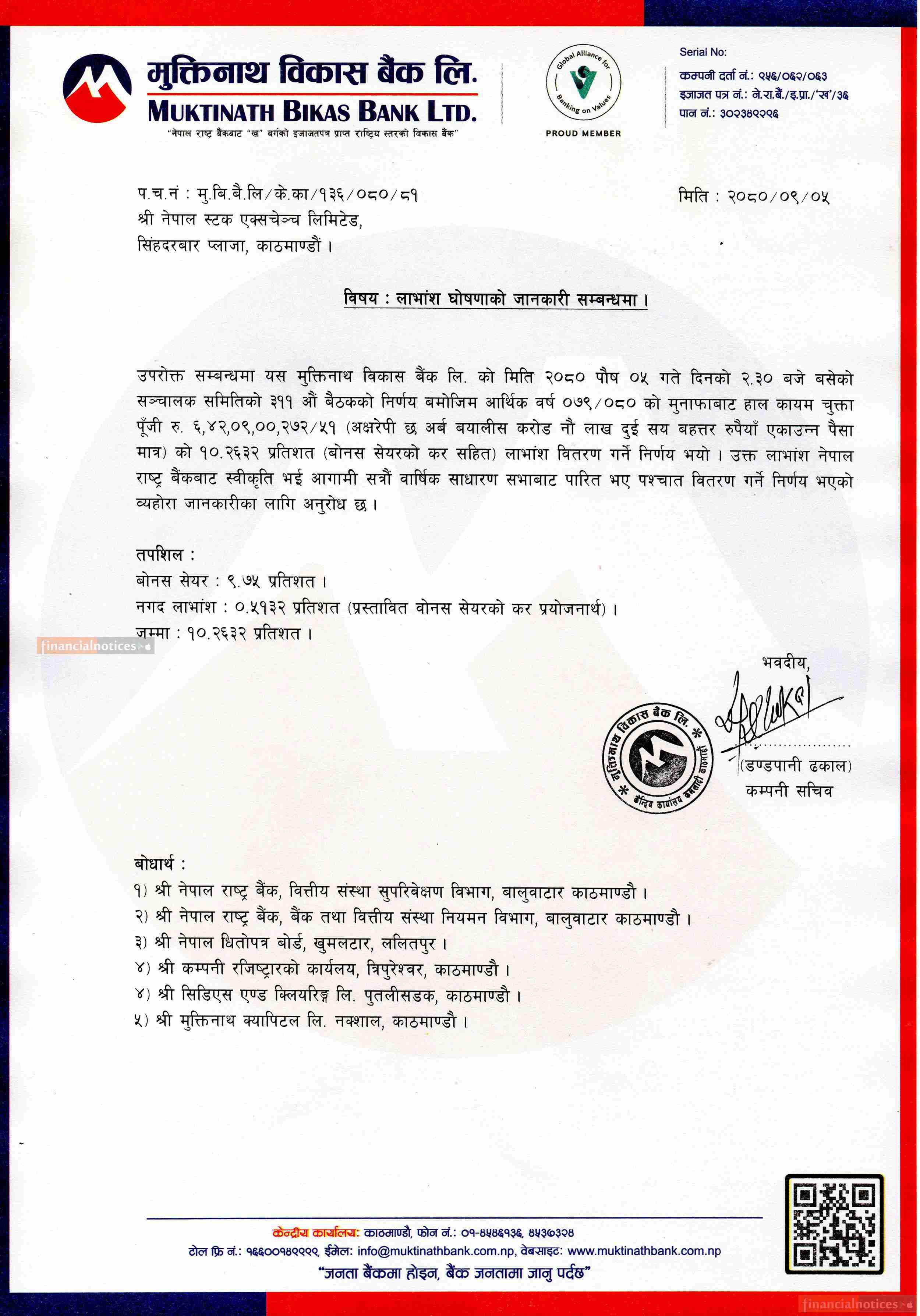 मुक्तिनाथ विकास बैंकको लाभांश घोषणा सम्बन्धी सूचना