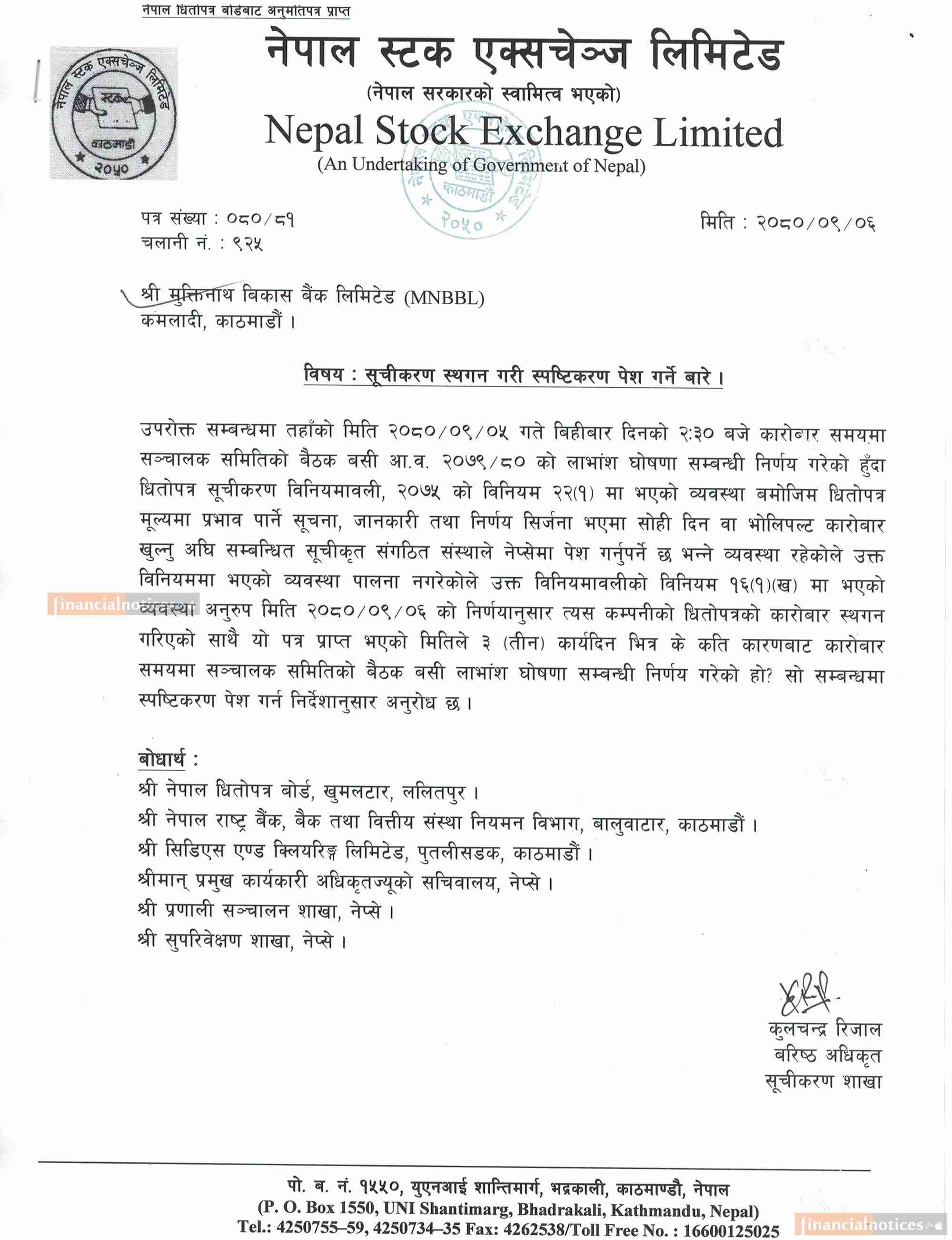 मुक्तिनाथ विकास बैंकको सेयर कारोबार रोक्का सम्बन्धी सूचना