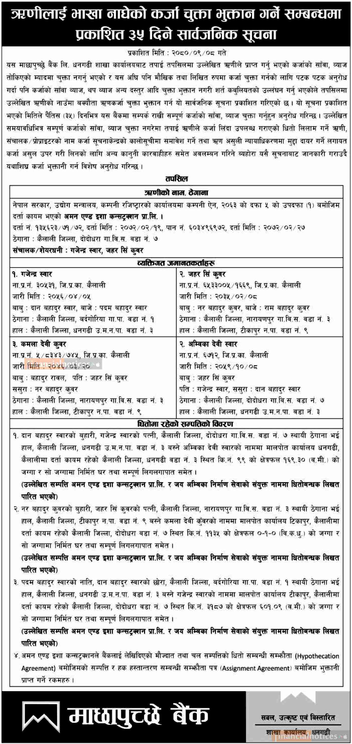 माछापुच्छ्रे बैंकको भाखा नाघेका ऋणहरुलाई कर्जा चुक्ता भुक्तान गर्न आउने बारे सूचना -