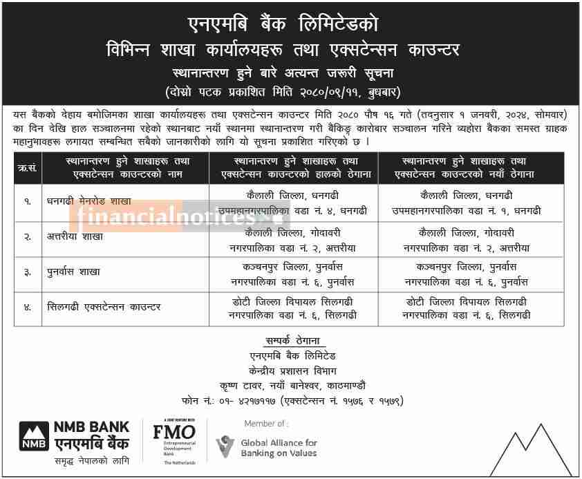 एनएमबि बैंकको विभिन्न शाखा कार्यालयहरु तथा एक्सटेन्सन काउण्टर स्थानान्तरण बारे सूचना