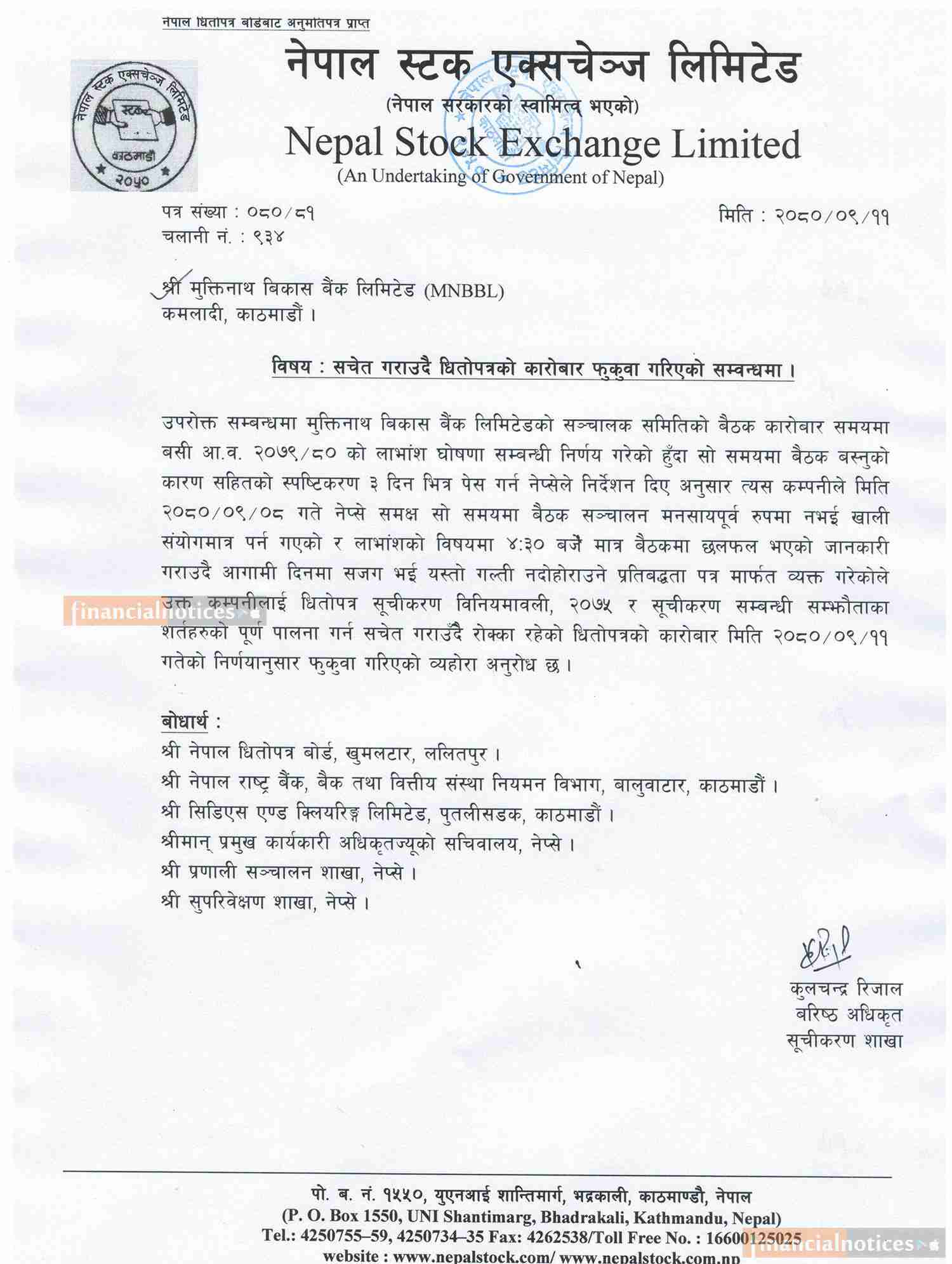 मुक्तिनाथ विकास बैंकको स्पष्टीकरण सहित सेयर कारोबार फुकुवा सम्बन्धी सूचना