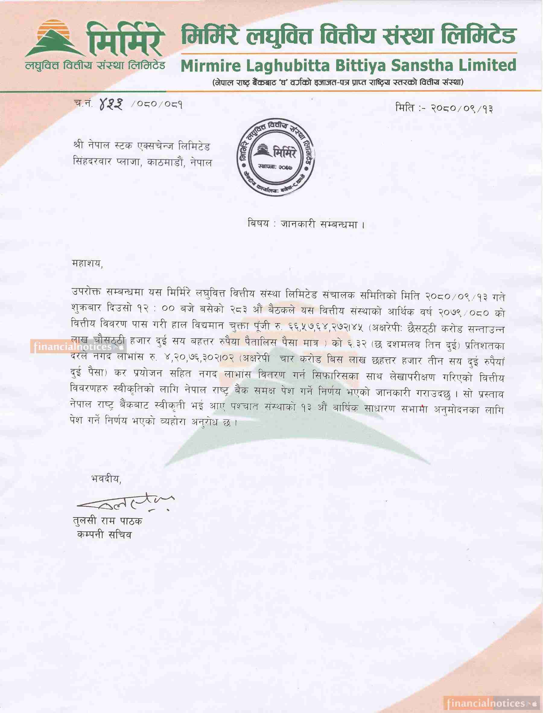 मिर्मिरे लघुवित्तको लाभांश घोषणा सम्बन्धी सूचना