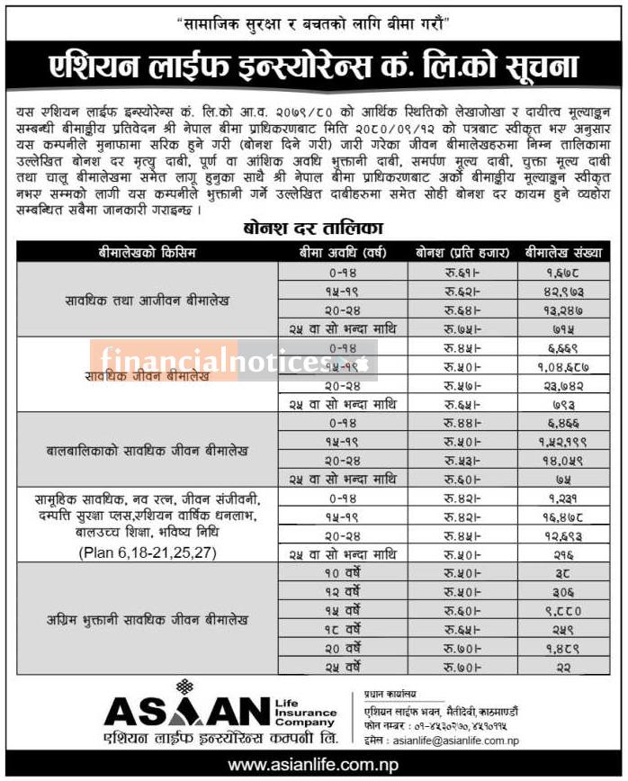 एशियन लाईफ इन्स्योरेन्सको बोनस दर तालिका सार्वजानिक गरिएको सम्बन्धी सूचना