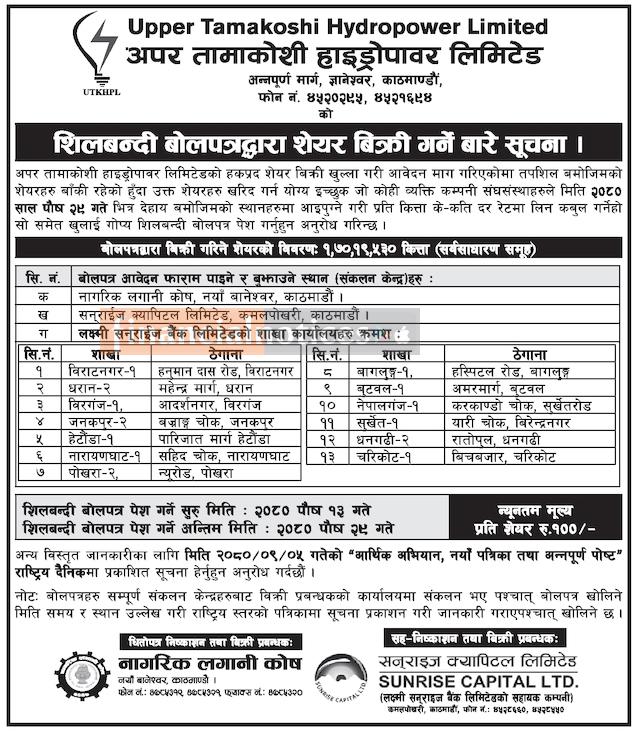 शिलबन्दी बोलपत्रद्धारा शेयर बिक्री गर्ने सम्बन्धी सूचना