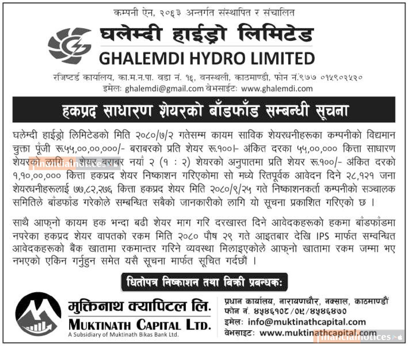 घलेम्दी हाइड्रोको हकप्रद साधारण शेयरको बाँडफाँड सम्बन्धी सूचना -