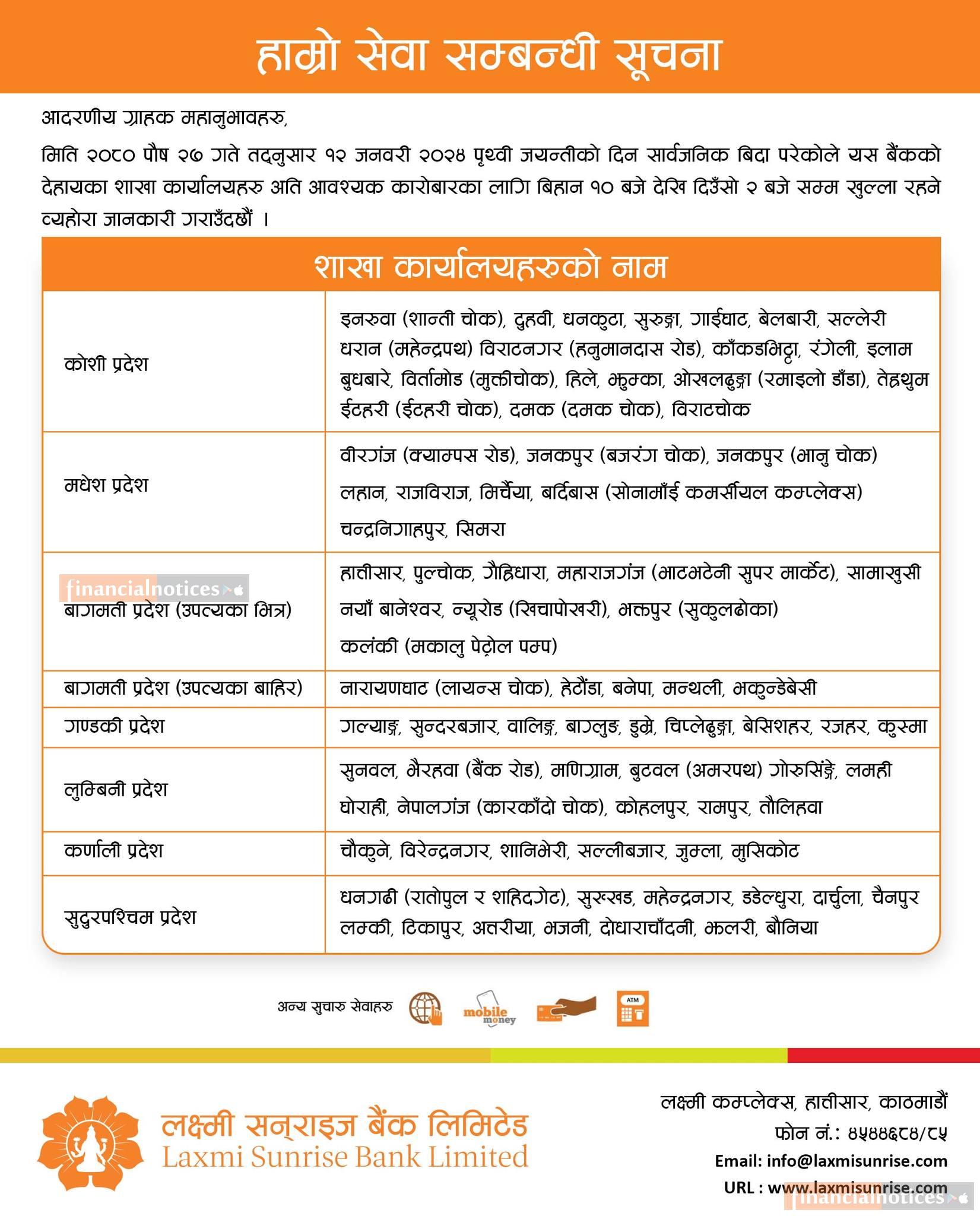 सार्वजनिक विदाको दिन लक्ष्मी सनराइज बैंक कति बजेसम्म खुल्ला रहन्छ ? -