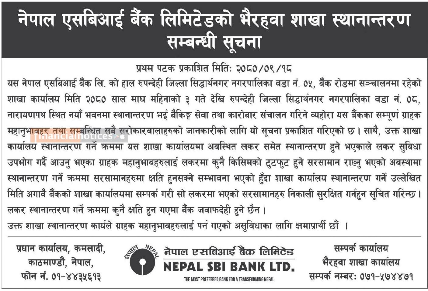 नेपाल एसबिआई बैंकको शाखा स्थानान्तरण सम्बन्धी सूचना