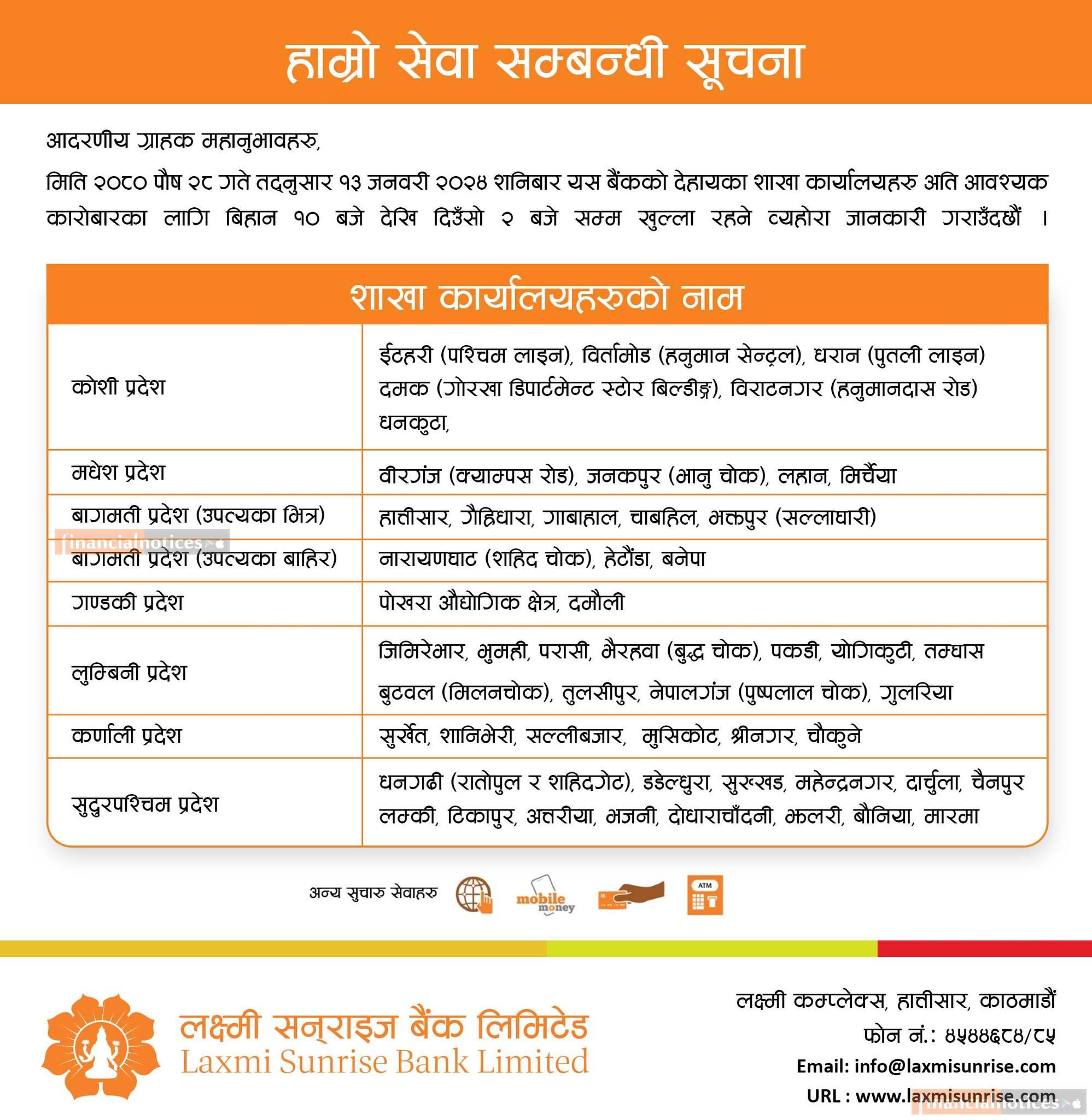 लक्ष्मी सन्राइज बैंकको विभिन्न प्रदेशका शाखाहरु खुल्ला रहने सम्बधी सूचना