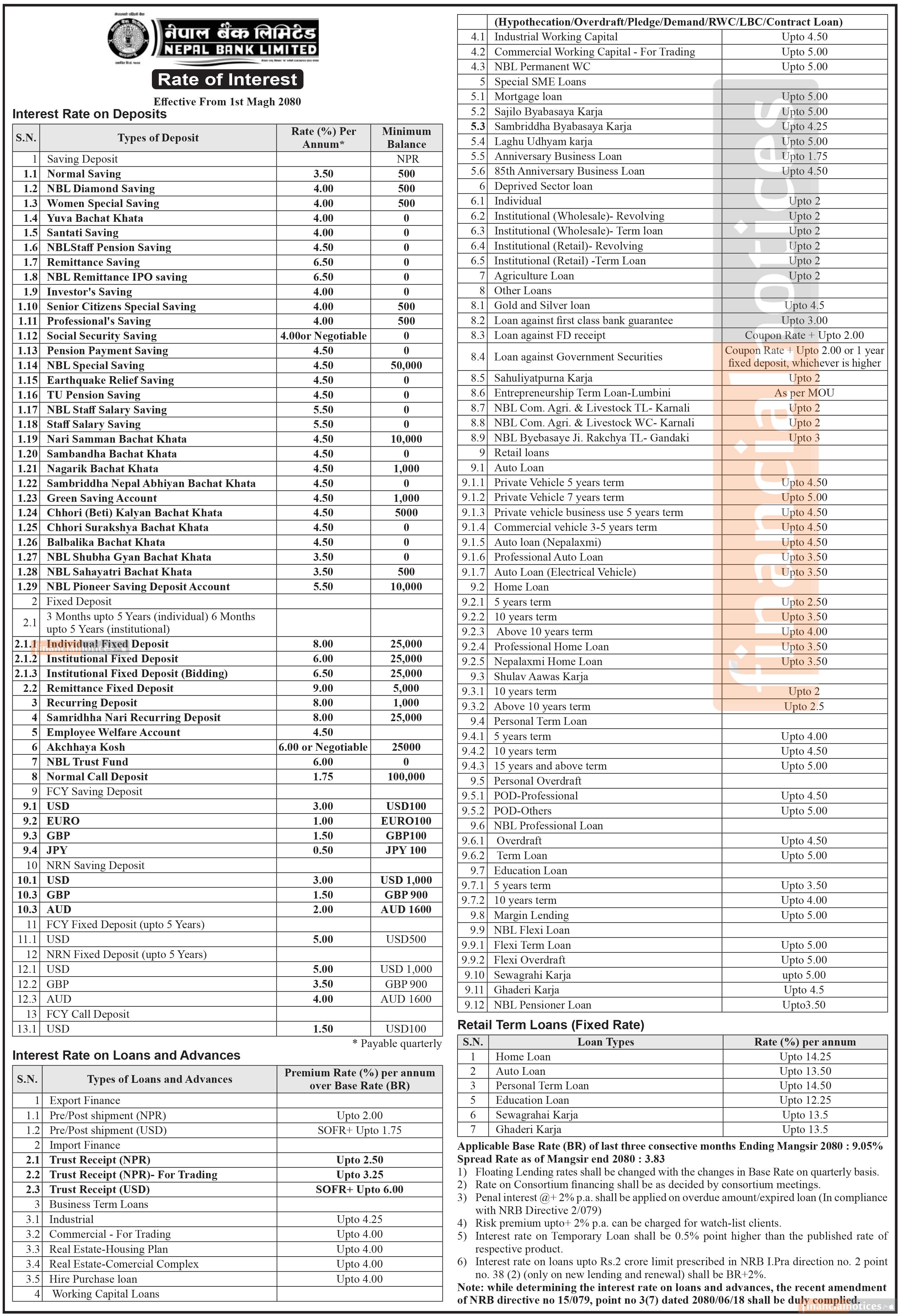 नेपाल बैंकको माघ १ गतेदेखि लागु हुने नयाँ ब्याजदर तालिका सार्वजनिक - Interest Rates-