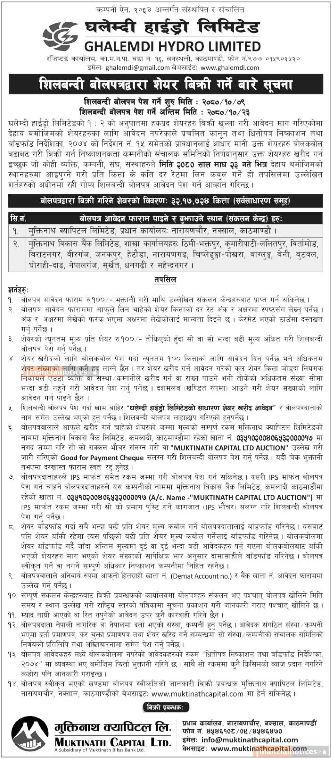 घलेम्दी हाइड्रोको शिलबन्दी बोलपत्रद्वारा शेयर बिक्रीको सूचना -