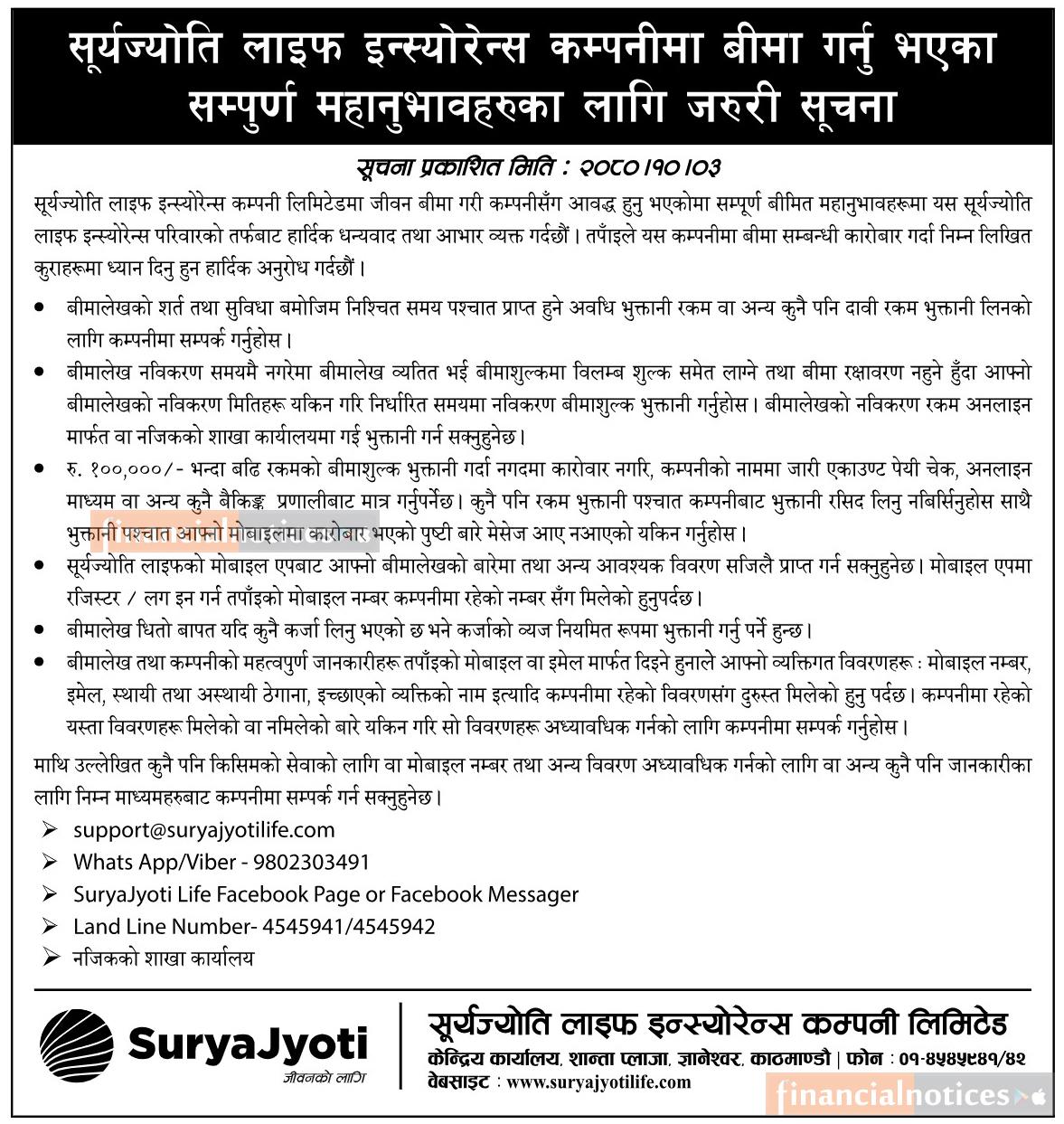 सूर्यज्योति लाईफ इन्स्योरेन्स्को जरुरी सूचना