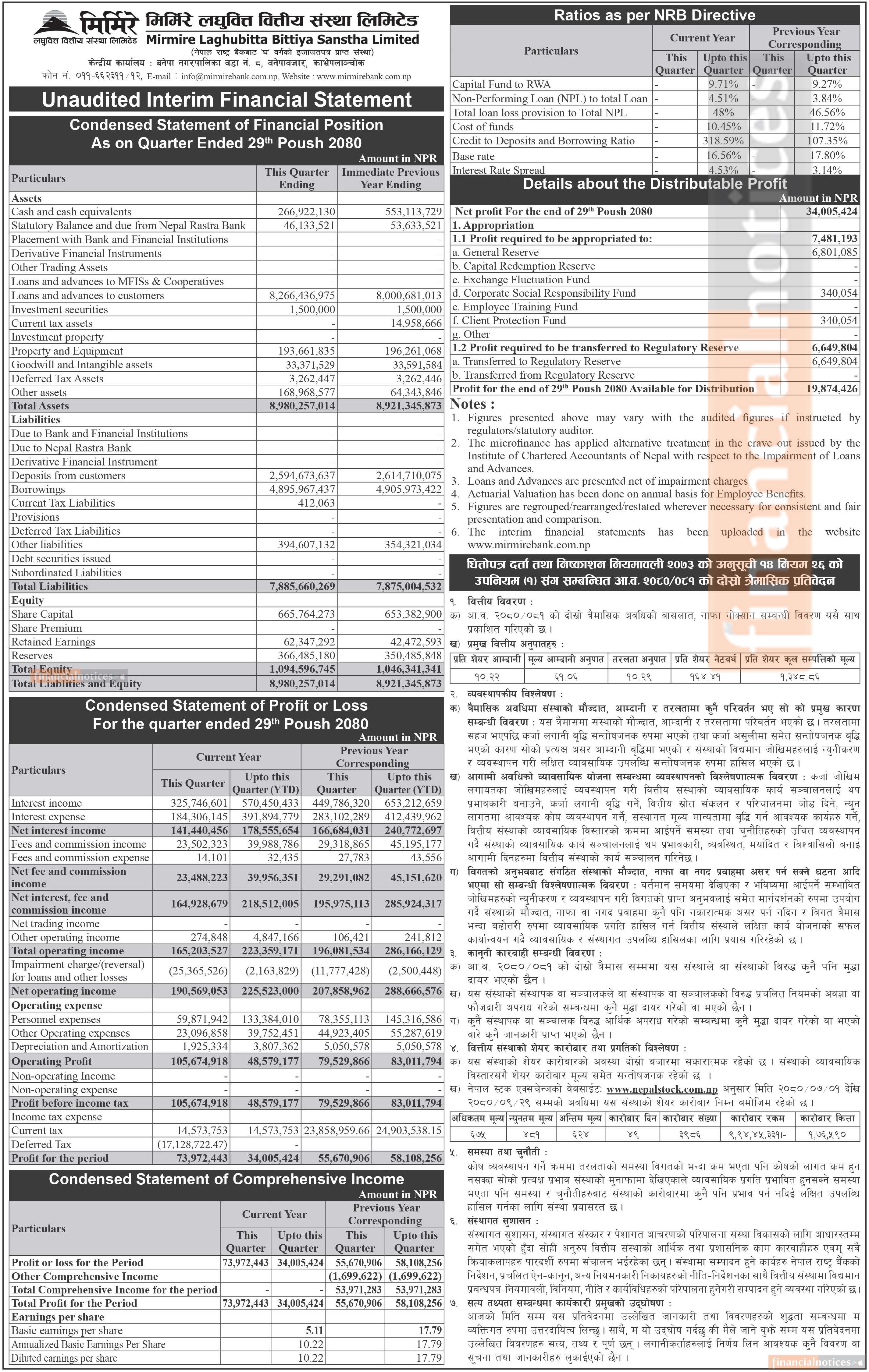 मिर्मिरे लघुवित्तको खुद नाफा ३ करोड ४० लाख ५ हजार रुपैयाँ - Quarterly Report -
