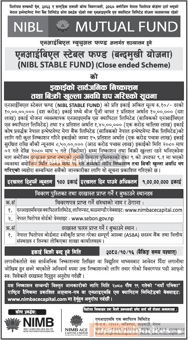 एनआईबिएल स्टेबल फण्डको इकाईका लागि आवेदन दिने म्याद थप गरिएको सम्बन्धी सूचना