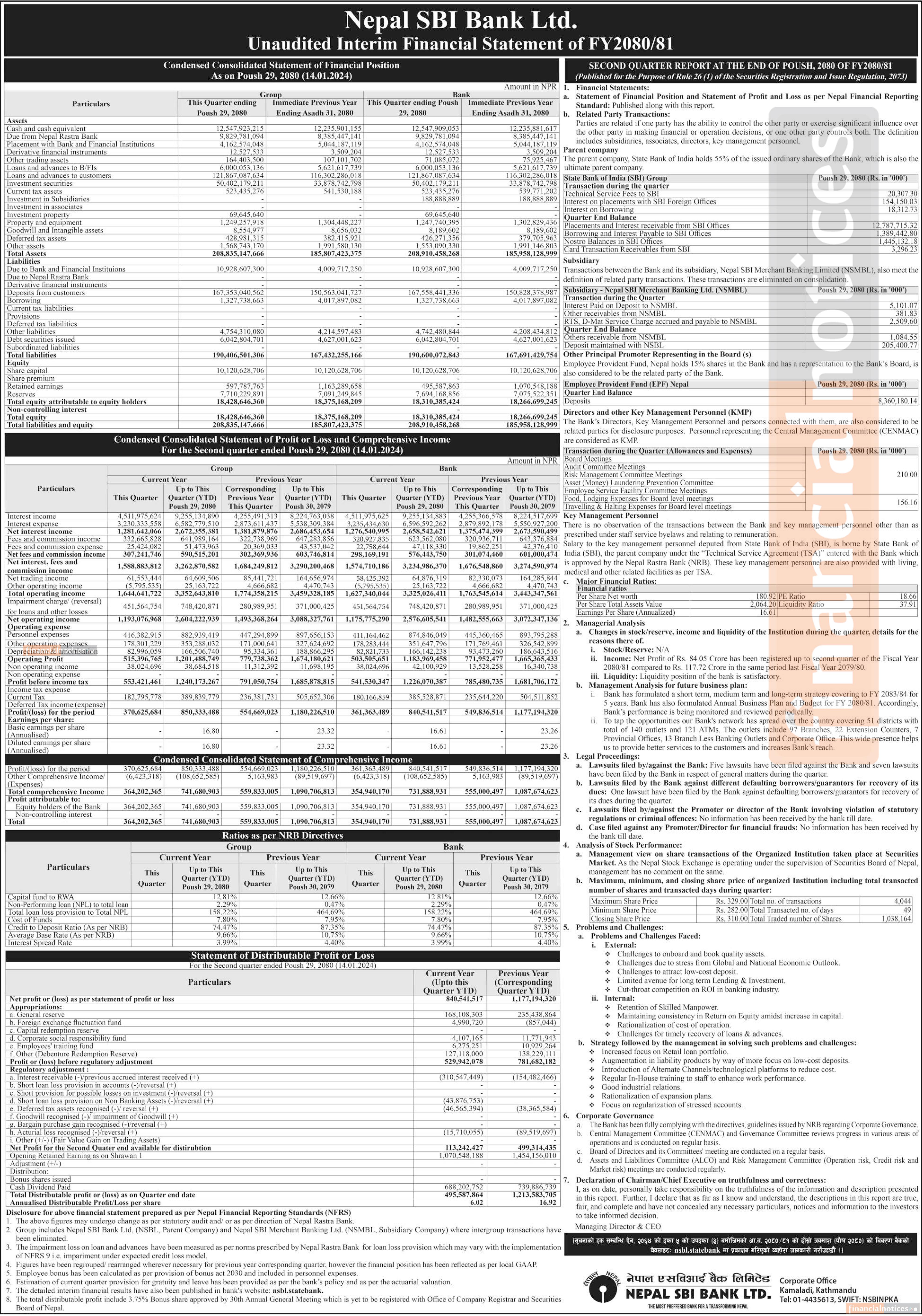 नेपाल एसबीआई बैंकको दोस्रो त्रैमाससम्ममा खुद नाफा ८४ करोड ५ लाख ४१ हजार रुपैयाँ - Q2 Report -