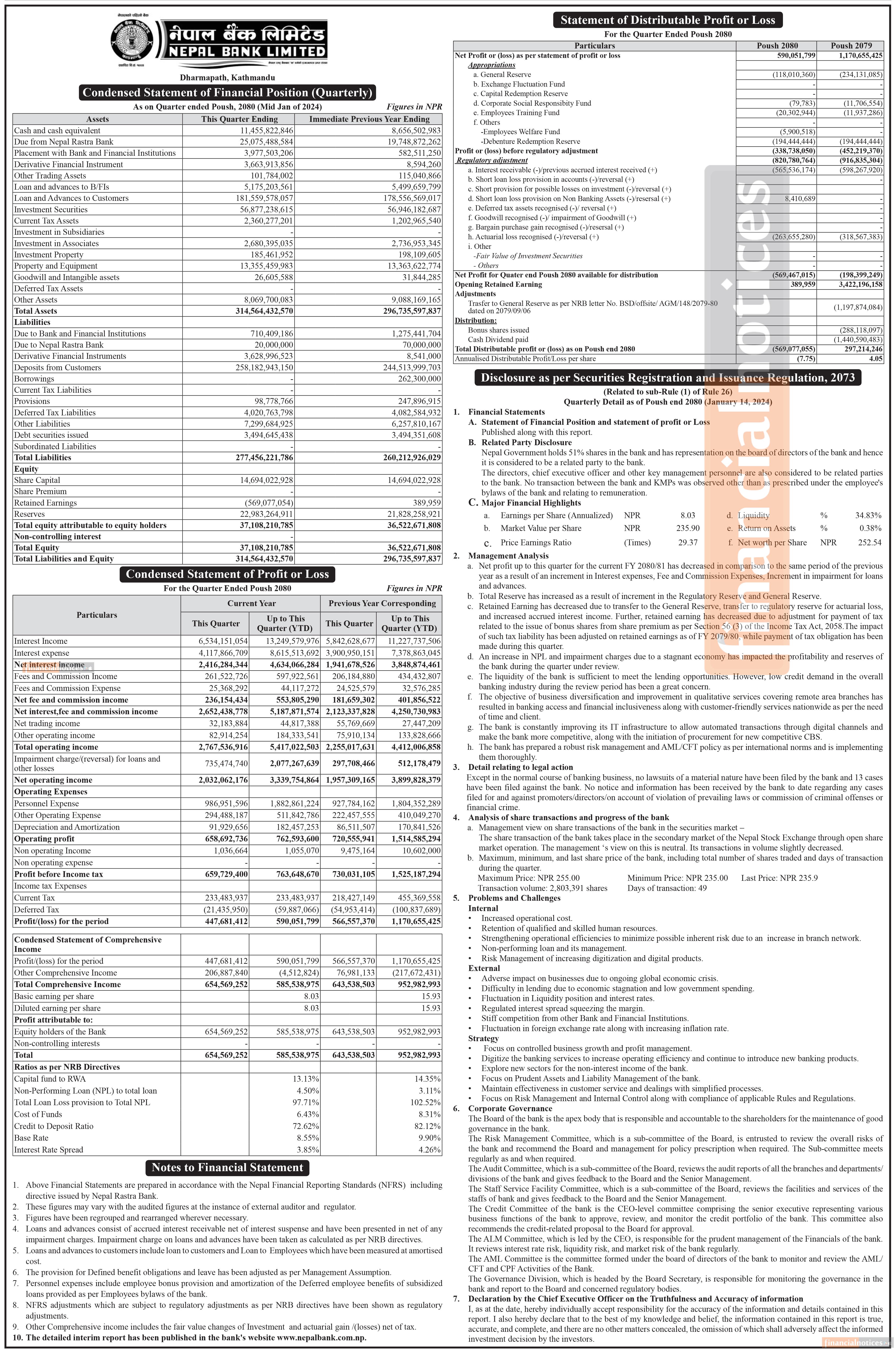 नेपाल बैंकको मुनाफा खुद नाफा ४९.६० प्रतिशतले घट्यो, वितरणयोग्य नाफा पनि ऋणात्मक -