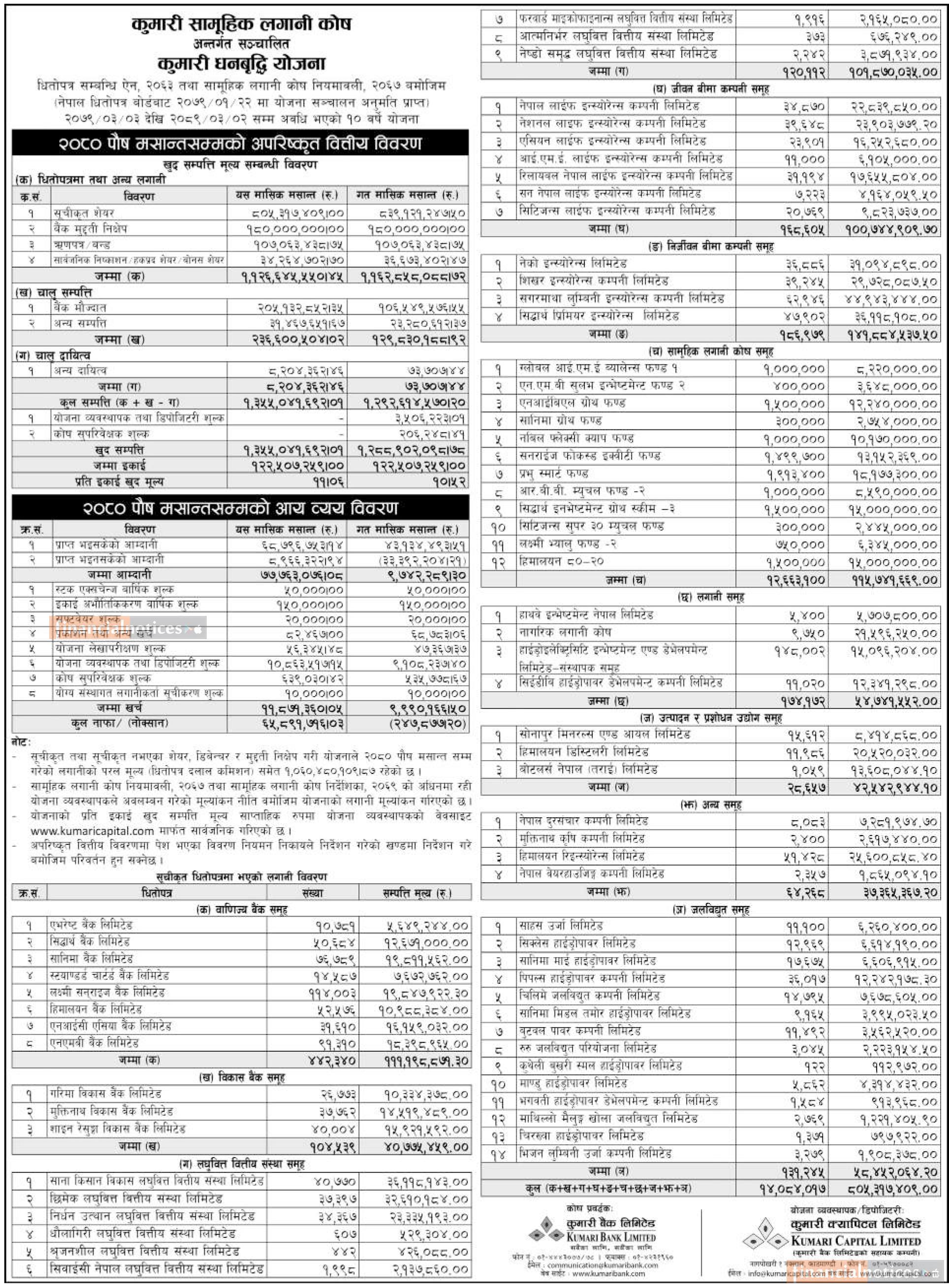 Kumari Capital has published Kumari Dhanabriddhi Yojana NAV till Poush, 2080