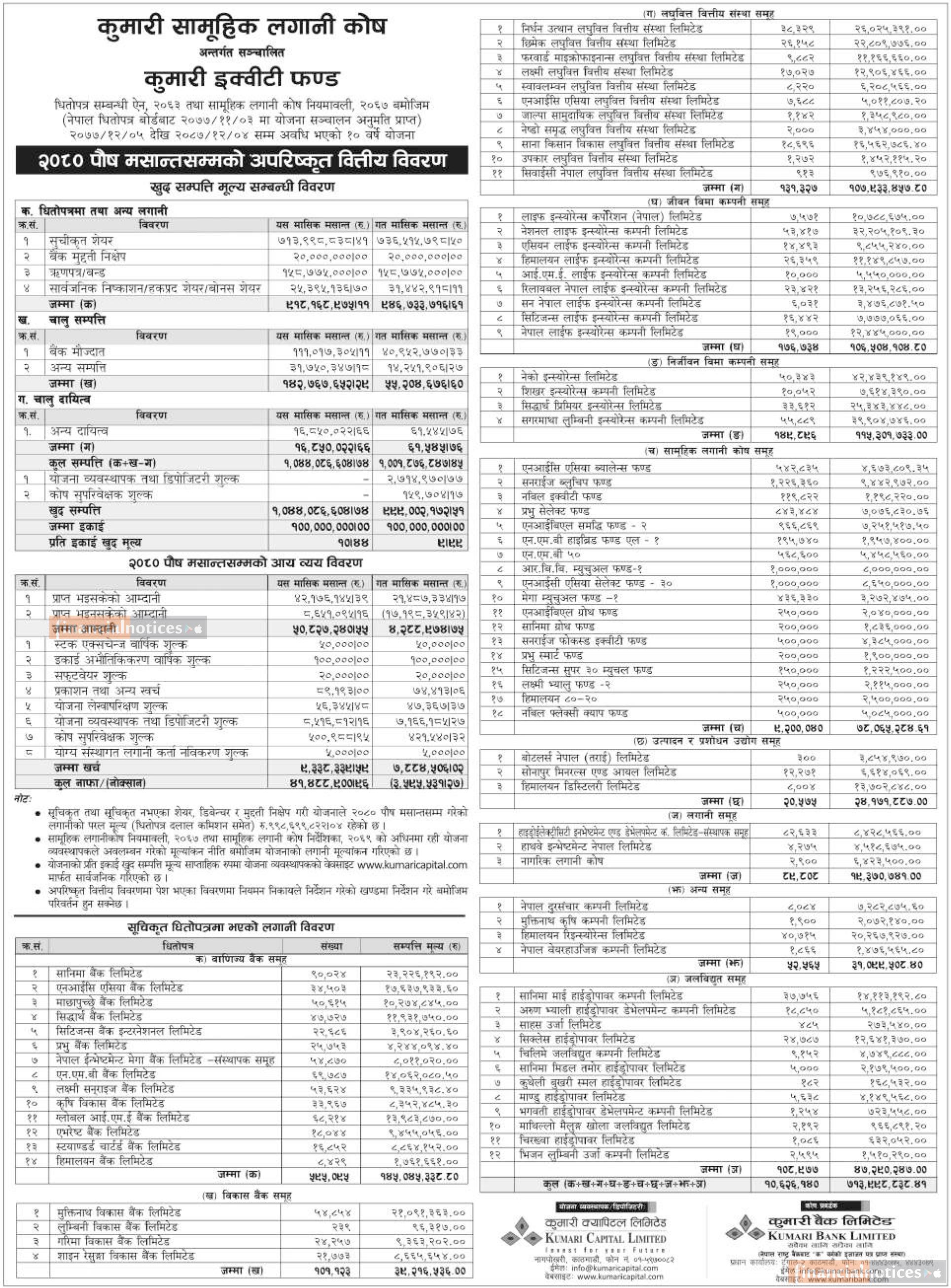 Kumari Capital published Kumari Equity Fund NAV till Poush, 2080