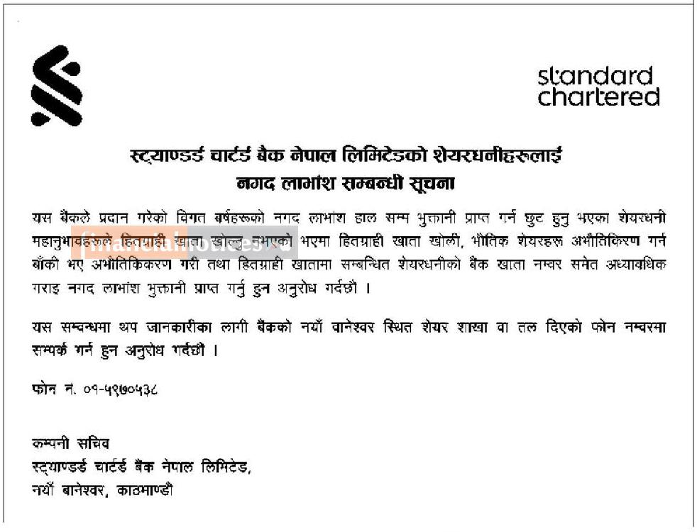 स्टान्डर्ड चार्टर्ड बैंकको नगद लाभांस वितरण सम्बन्धी सूचना