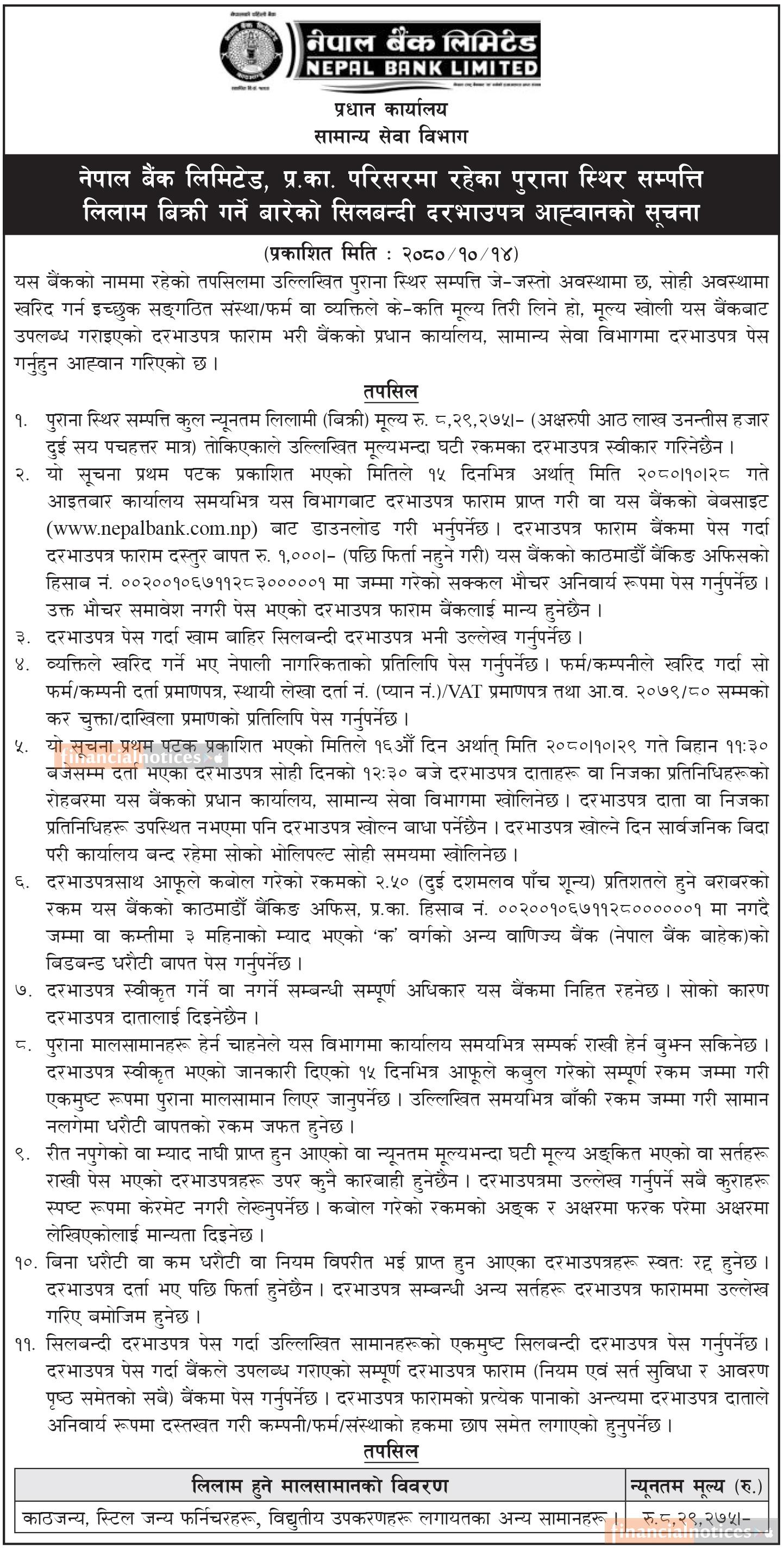 स्थिर सम्पत्ति लिलाम बिक्री गर्ने सम्बन्धी सूचना