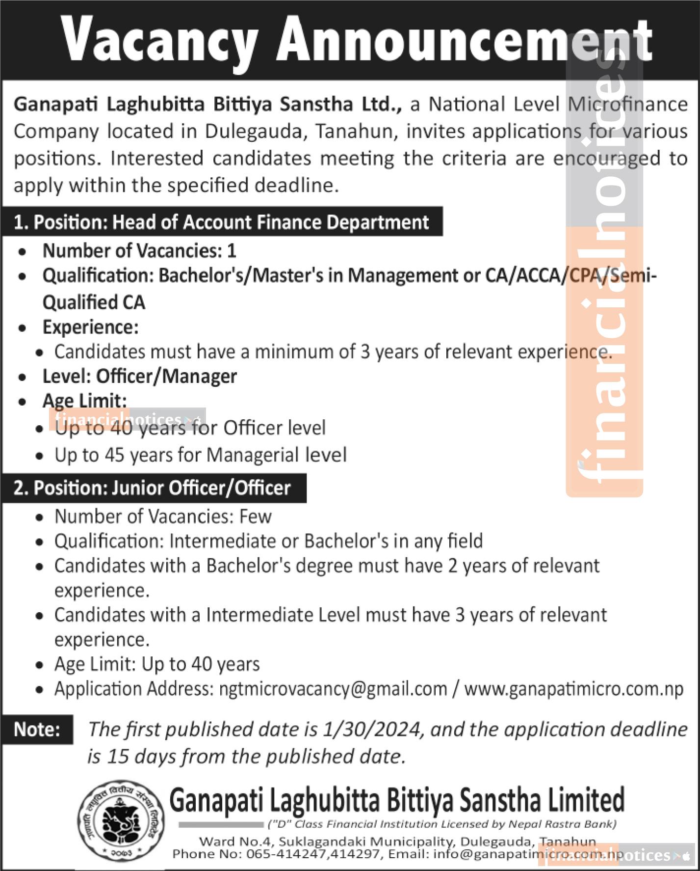 The initial publication date of this announcement is 1/30/2024, and the deadline for submitting applications is 15 days from the publication date. Don't miss this opportunity to be a part of Ganapati Laghubitta's dynamic team!