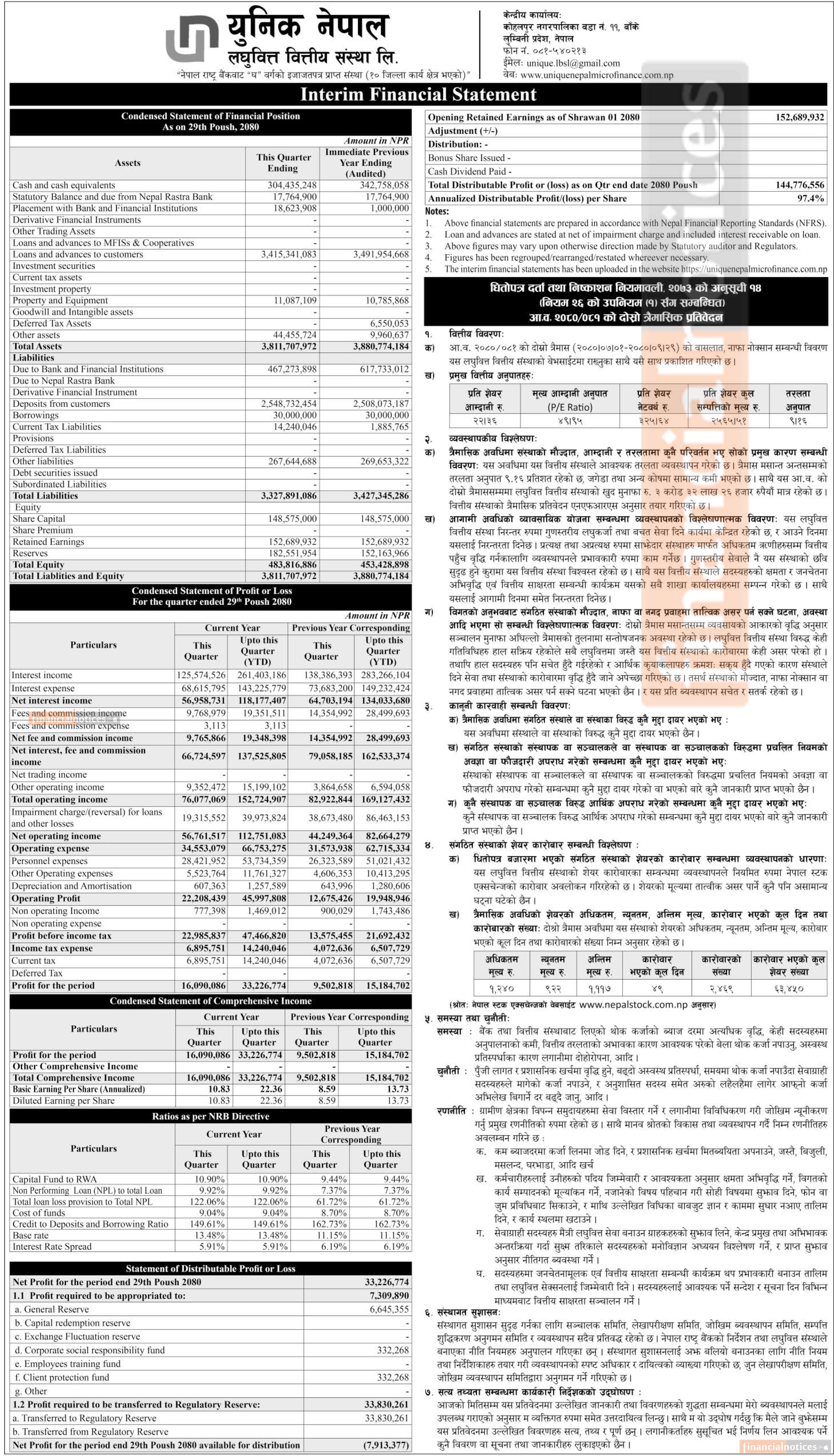 युनिक नेपाल लघुवित्तको खुद नाफा ११८.८२ प्रतिशतले बढेर ३ करोड ३२ लाख २६ हजार रुपैयाँ