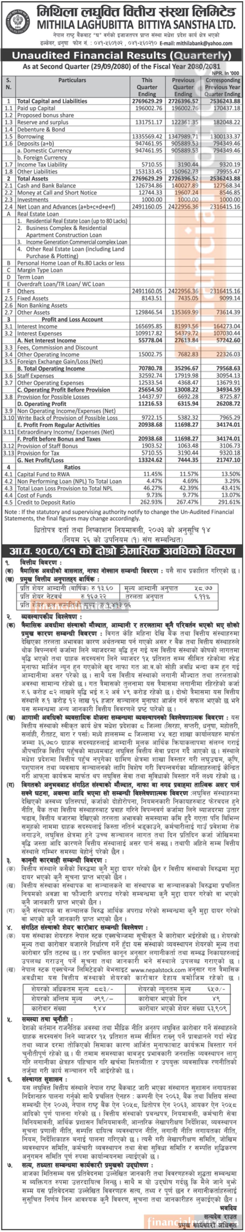 मिथिला लघुवित्तको खुद नाफा १ करोड ३२ लाख २४ हजार रुपैयाँ