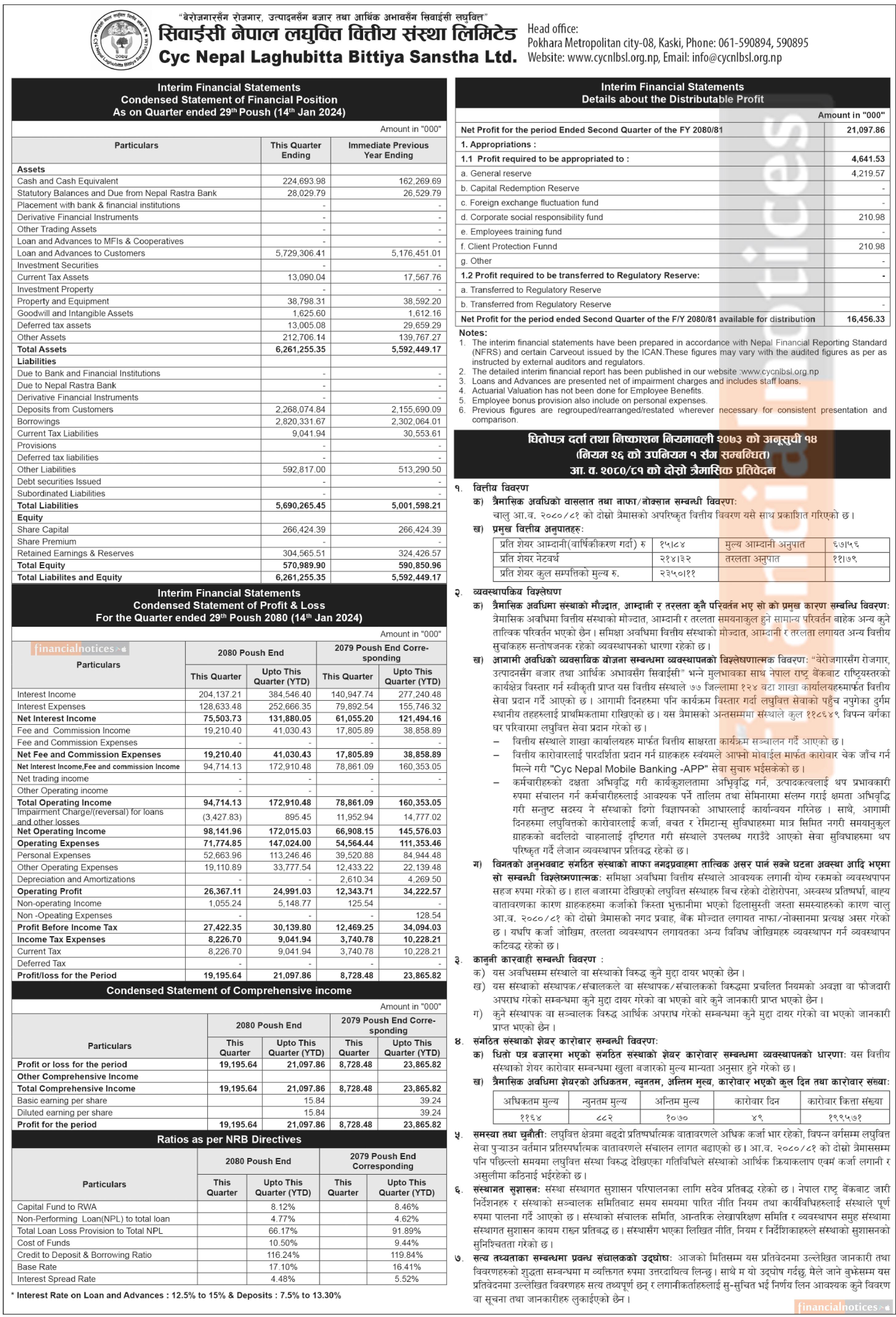 सिवाईसी नेपाल लघुवित्तको खुद नाफा २ करोड १० लाख ९७ हजार रुपैयाँ - Q2 Report -