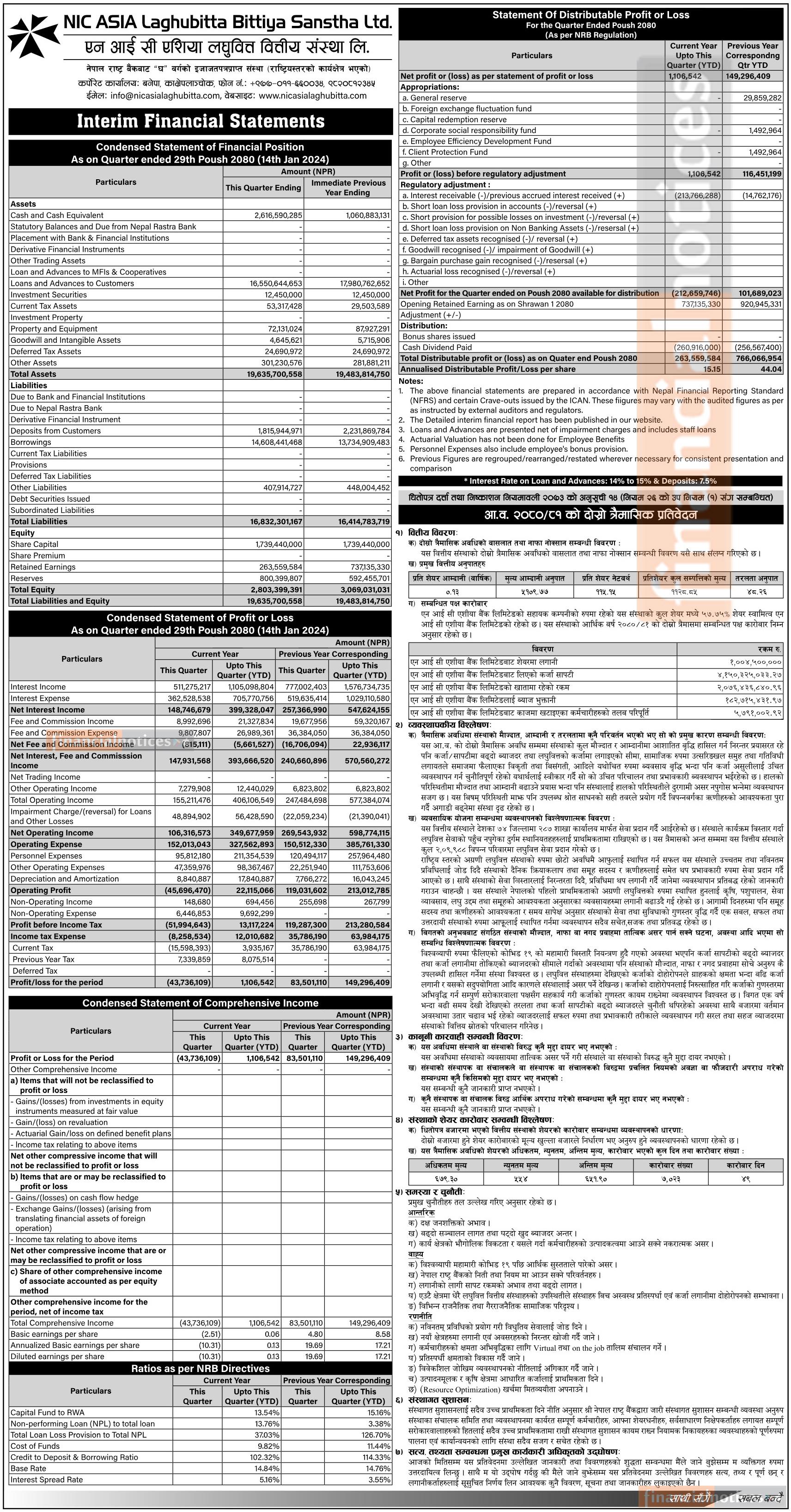 एनआइसी एसिया लघुवित्तको खुद नाफा ९९.२६ प्रतिशतले घटेर ११ लाख ६ हजार रुपैयाँ - Q2 Report -