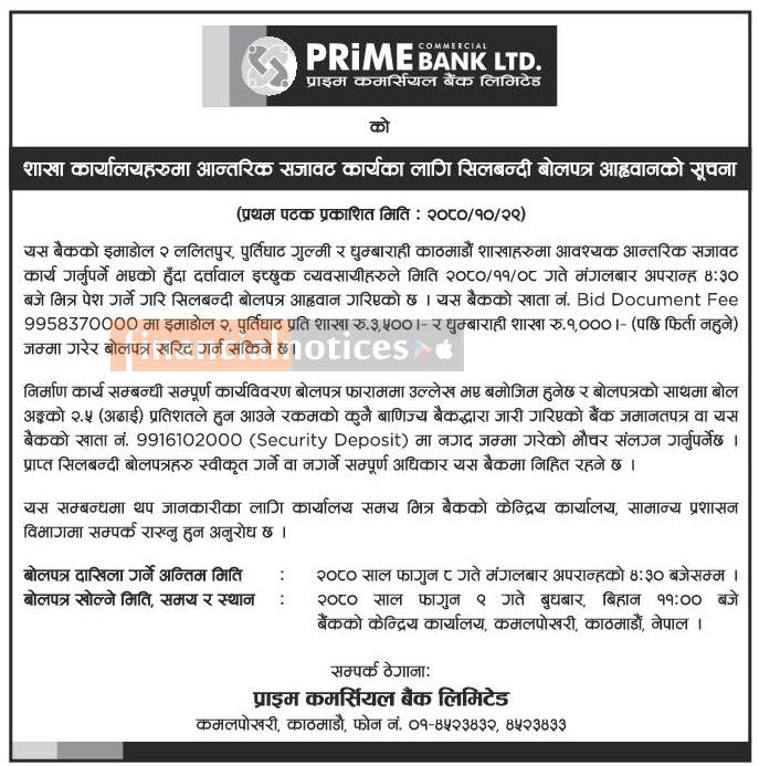 शाखा कार्यालयहरुमा आन्तरिक सजावट कार्यका लागि सिलबन्दी बोलपत्र आह्वानको सूचना -