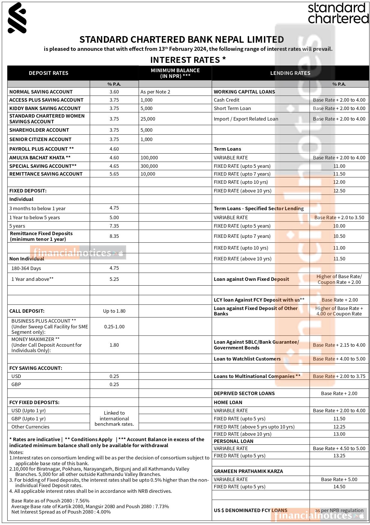स्टान्डर्ड चार्टर्ड बैंकको फागुन १ गतेदेखि लागु हुने नयाँ ब्याजदर तालिका सार्वजनिक -