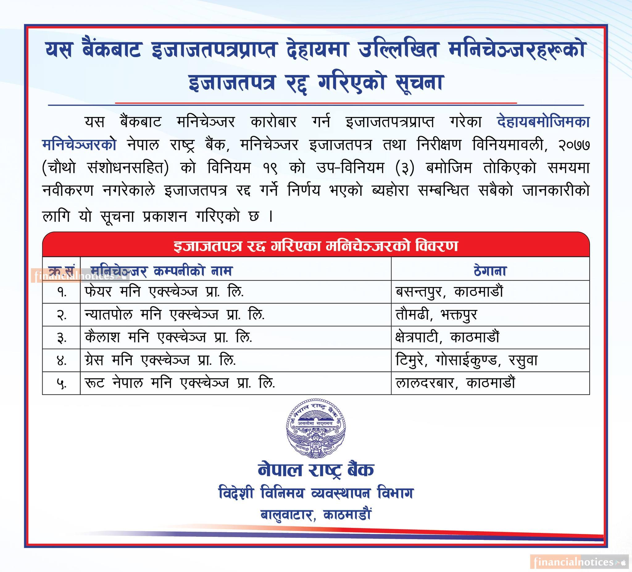 राष्ट्र बैंकद्वारा पाँच मनीचेन्जर कम्पनीको इजाजतपत्र रद्द गरिएको बारे सूचना