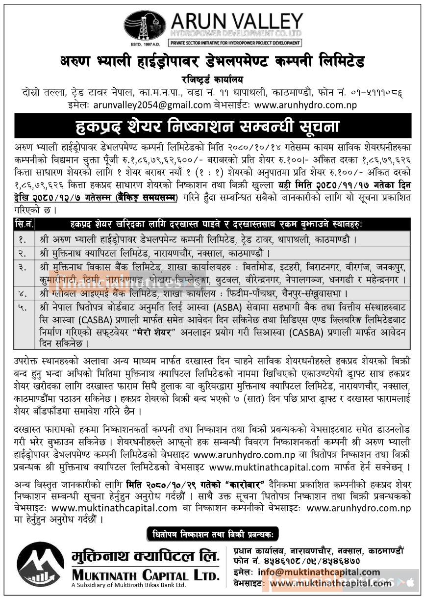 अरुण भ्यालीको हकप्रद शेयर निष्काशन सम्बन्धी सूचना