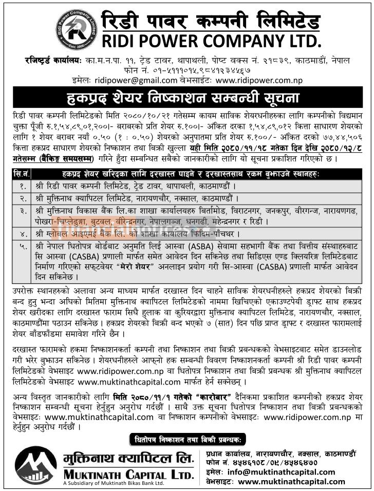 रिडि पावर कम्पनीको हकप्रद शेयर निष्काशन सम्बन्धी सूचना