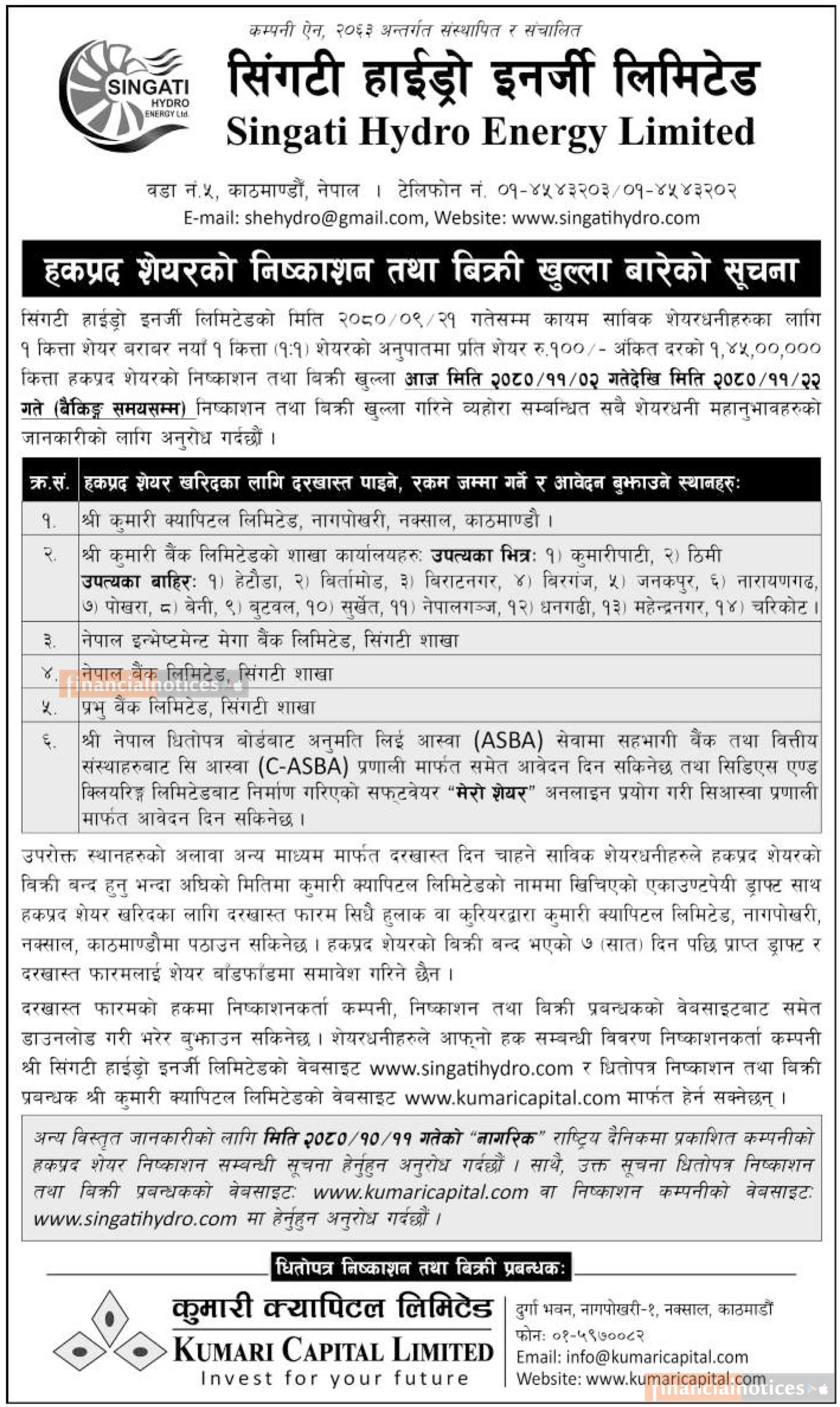 सिंगटी हाइड्रोको हकप्रद शेयर आजदेखि आवेदन खुल्ला सम्बन्धी सूचना