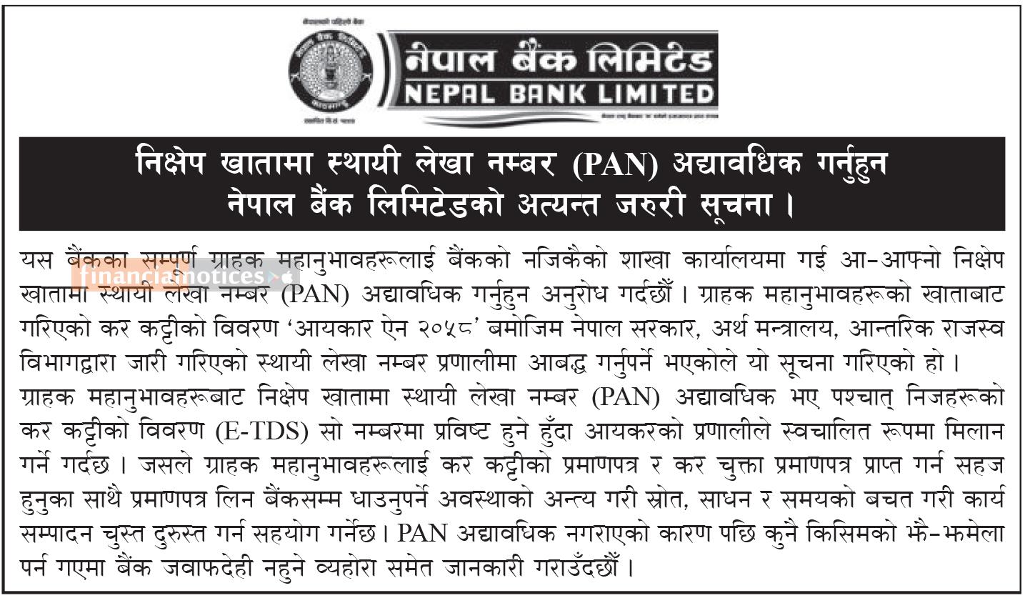 स्थायी लेखा नंबर अद्यावधिक गर्न नेपाल बैंकको जरुरी सूचना