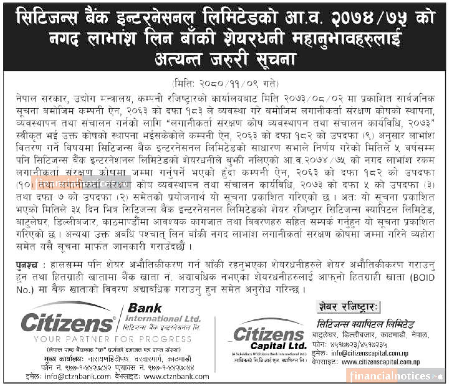 सिटिजन्स बैंकको नगद लाभांस लिन बाँकी शेयरधनीहरुलाई अत्यन्त जरुरी सूचना