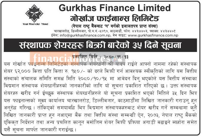 संस्थापक शेयरहरु बिक्री सम्बन्धी ३५ दिने सूचना