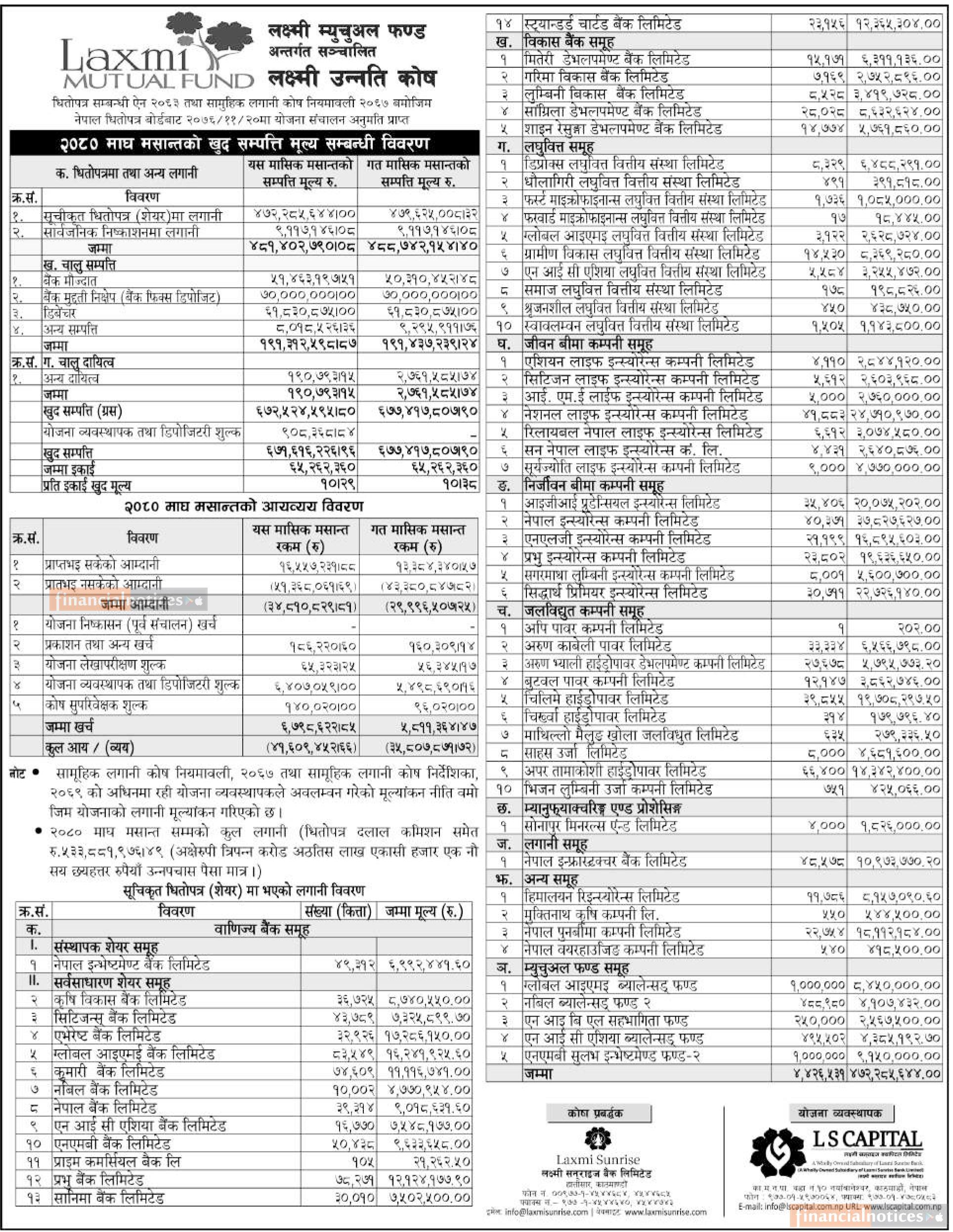 LS Capital has published the Laxmi Unnati Kosh Net Asset Value till Magh, 2080