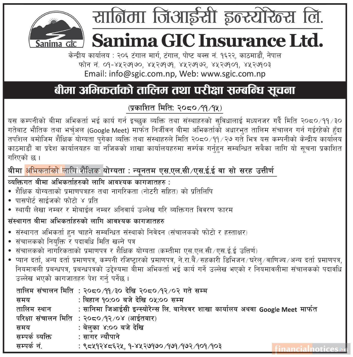 बीमा अभिकर्ताको तालिम तथा परिक्षा सम्बन्धी सूचना