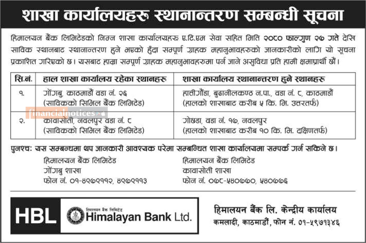 हिमालयन बैंकको शाखा कार्यालयहरु स्थानान्तरण सम्बन्धी सूचना