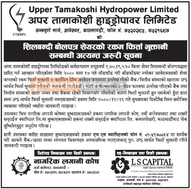 शेयरको रकम फिर्ता भुक्तानी सम्बन्धी अत्यन्त जरुरी सूचना