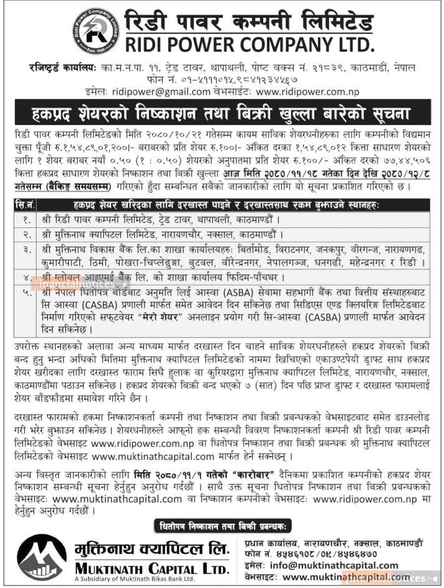 रिडी पावरको हकप्रद निष्काशन तथा बिक्री खुला बारे सूचना