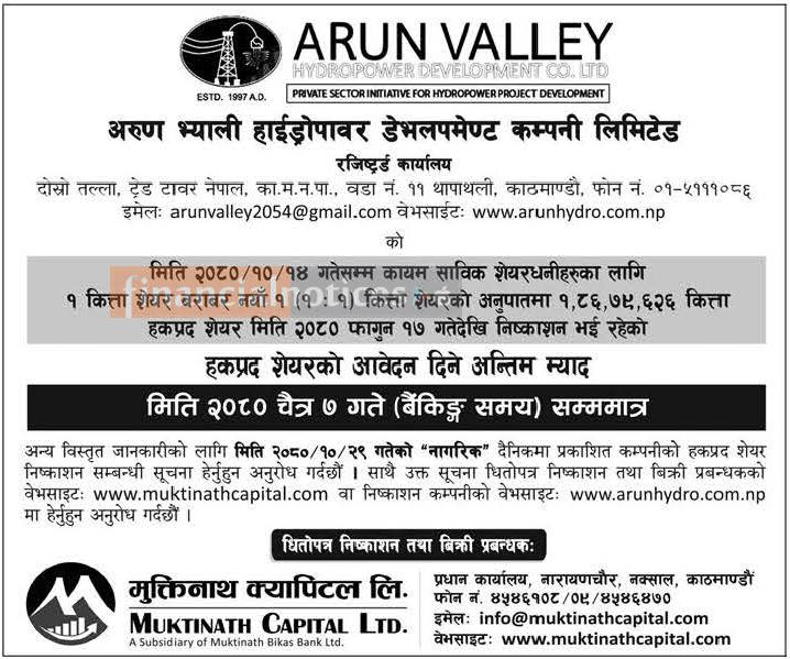 अरुण भ्याली हाइड्रोको हकप्रद शेयर खुल्ला भइरहेको बारे सूचना