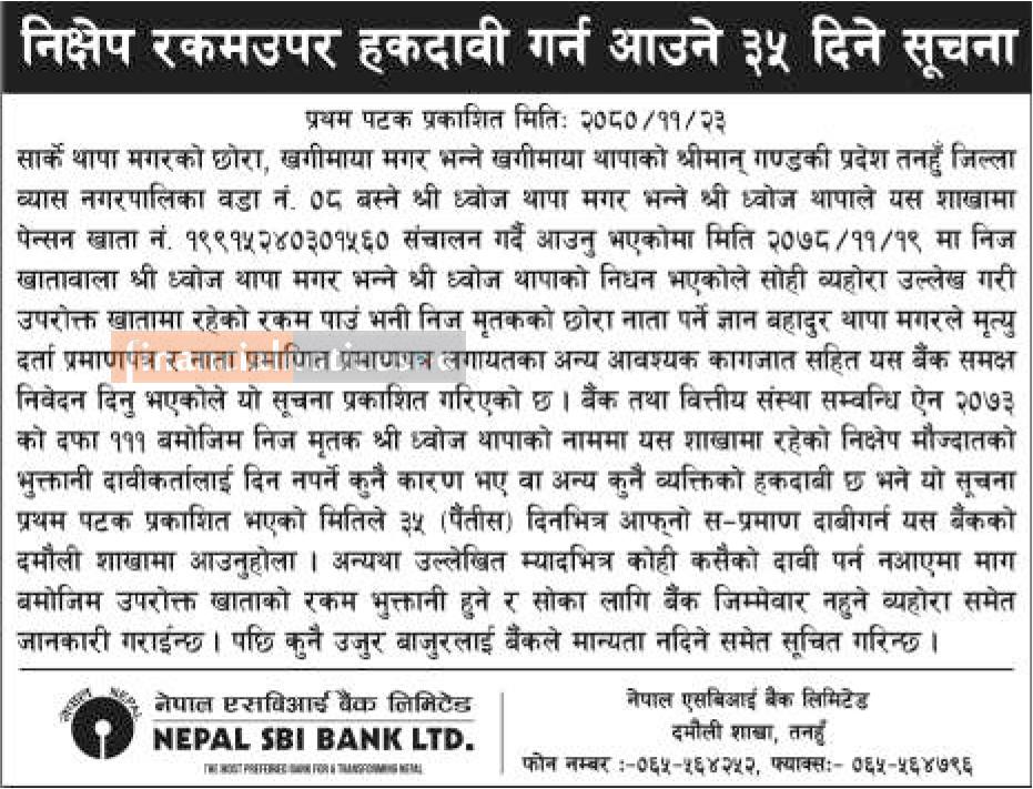निक्षेप रकमउपर हकदावी गर्न आउने सम्बन्धी ३५ दिने सूचना