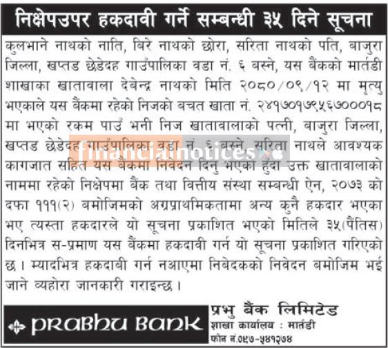 निक्षेप उपर हकदावी गर्ने सम्बन्धी ३५ दिने सूचना