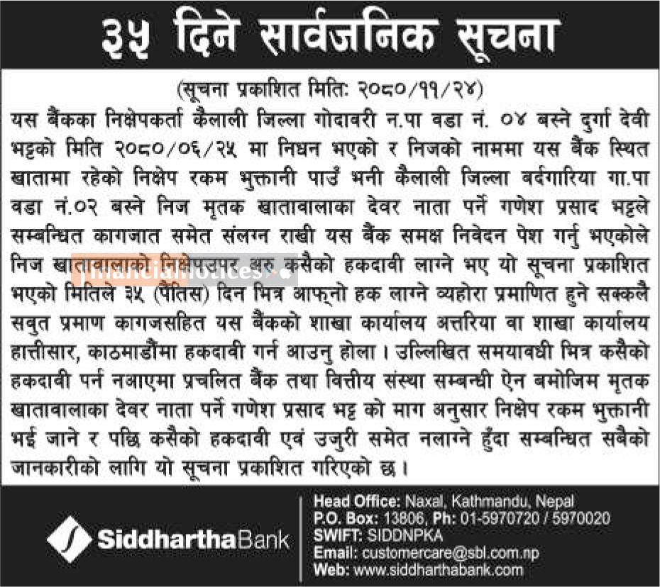 सिद्धार्थ बैंकको ३५ दिने सार्वजानिक सूचना
