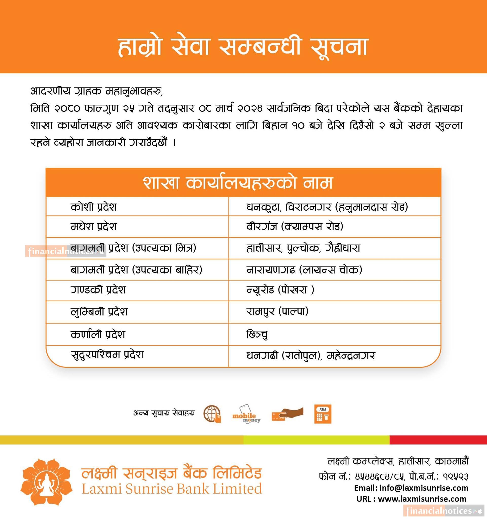 लक्ष्मी सन्राइज बैंकको शाखा कार्यालय खुल्ला रहने बारे जरुरी सूचना